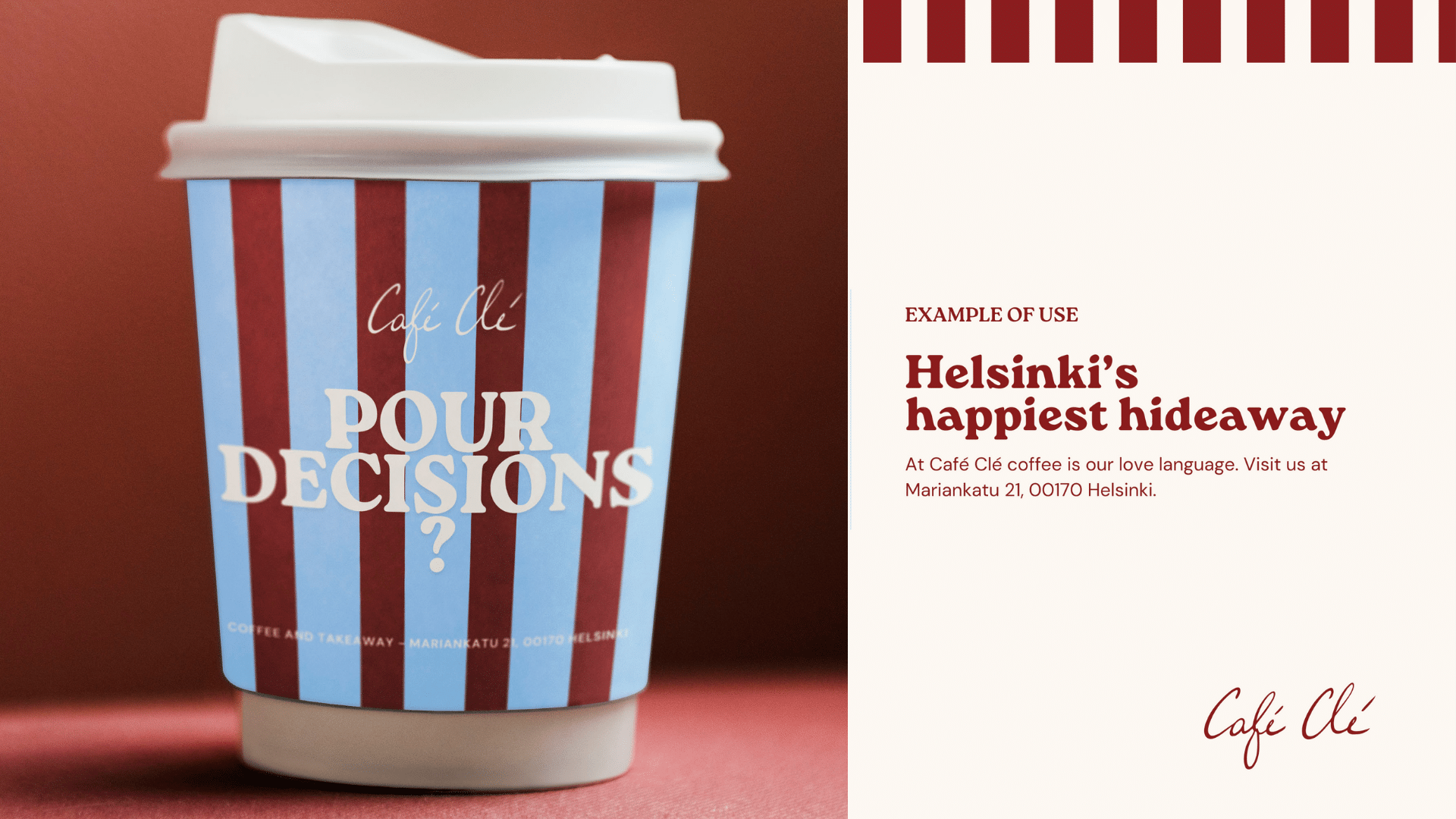 Café Clé on pieni suosittu kahvila Helsingin Kruununhaassa. Vriendly tiivisti kahvilan lämpimän, energisen tunnelman visuaaliseksi ilmeeksi.